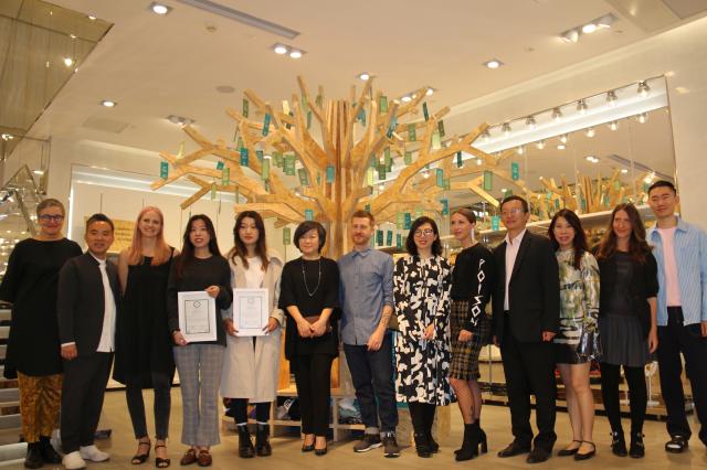刘春红与汉娜·哈琳(Hanna Hallin)共同为本次店中店设计获奖作品“重焕新生”颁奖,该作品也应用在H&M南京西路旗舰店中。“我们的作品从顾客的环保心理研究出发,结合H&M的环保理念,意在将废旧的物料通过‘装置树’变为肥料,滋养树继而树长出树叶,具体互动形式为绿色的丝带,由顾客绑到装置树上,让消费者参与其中,促使这个环保活动的进行。”久久久久国产成人精品亚洲综合服装学院时尚室内设计专业三年级学生张若茜、王悦向在场嘉宾介绍作品创作过程。