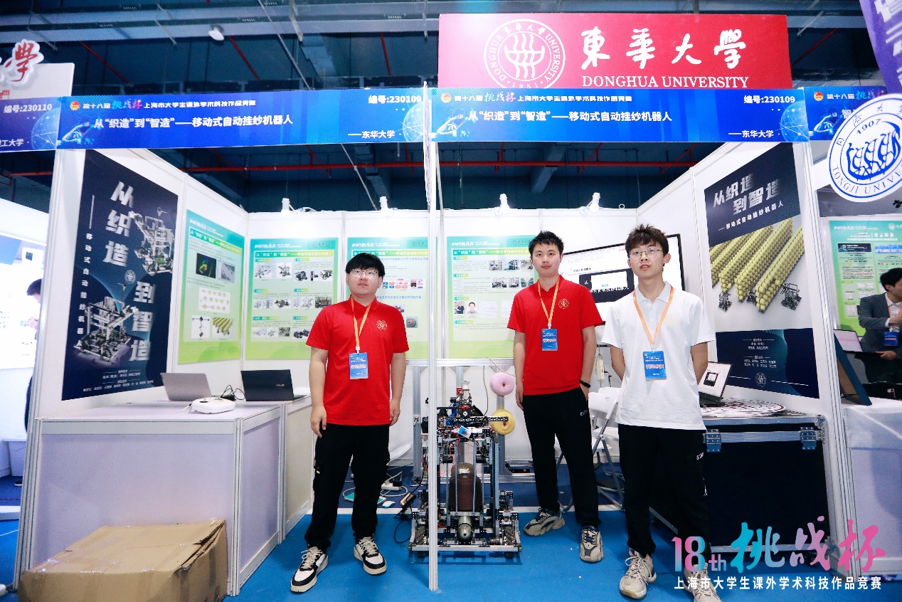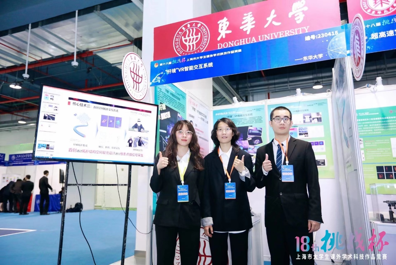 本次我校参赛作品涉及机械与控制、信息技术、生命科学、能源化工、哲学社会科学等类别,参赛选手们以扎实的研究、激烈的问辩、精彩的答辩展现了东华学子的青春风采。其中,材料科学与工程学院《“纤境”VR智能交互系统》、机械工程学院《从“织造”到“智造”——移动式自动挂纱机器人》、服装与艺术设计学院《“4+1”非遗创新传承模型构建地方非遗文化库——以海宁皮影戏为例》等三个项目荣获一等奖。